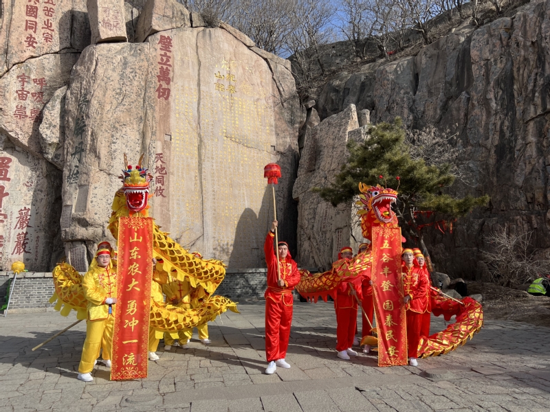 2024年是中国农历的辛亥年,生肖龙年;二月二龙抬头,是中国古老传统中的一个重要节日,这一天舞龙象征着新一年的希望与活力,承载着吉祥如意、风调雨顺的美好愿景。泰山,作为五岳之首,自古便是中华民族的精神象征,其雄伟壮丽的山势与深厚的文化底蕴相得益彰。齐鲁学子在龙年的农历二月初二,在泰山山顶舞龙,用实际行动和真切情感表达对中国传统节日的尊崇与敬意。