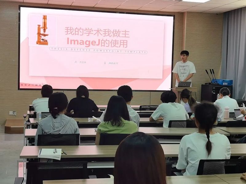 活动现场,多位同学带来精彩分享。王云逸围绕双荧光素酶实验展开讲解,介绍其在基因调控研究等领域的应用,让听众深入了解这一高灵敏度基因检测技术;方正冲聚焦“ImageJ的使用”,从软件基础功能到实操技巧,为同学们解锁科研图像分析新工具,助力提升学术研究效率;张文远针对“SRT申报书撰写要点及PPT示范讲解”,围绕SRT申报关键环节,从内容架构到PPT制作技巧,梳理撰写思路,助力科研启航第一步。