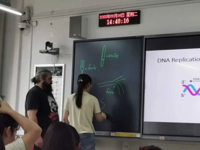 高频且深度的师生互动,是Franklin博士课堂的另一大亮点。两周时间里,他始终拒绝“单向知识输出”,每讲解完一个知识点,都会抛出针对性问题引导学生思考,例如“若五碳糖结构发生改变,会对核苷酸功能产生哪影响?”。面对学生的回答,他会及时肯定思路清晰的观点,对存在困惑的学生,则通过“你认为问题可能出在哪个分析环节?”等引导式提问,帮助其逐步梳理逻辑,充分调动学生的课堂参与感与主动思考能力,营造出“师生共探、趣味盎然”的课堂氛围。