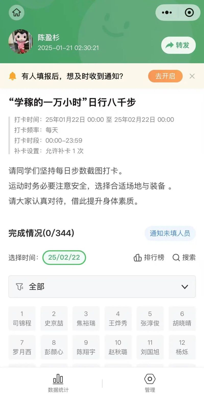 一、学业深耕,笃行不辍学业发展的50个小时,全体同学可以对本学期专业课程知识进行系统性复盘,梳理核心知识点与重难点内容,搭建清晰完整的知识框架,攻克学习中遗留的薄弱环节,为新学期课程学习筑牢基础。针对有学业提升规划的同学,备考四六级的同学要制定每日学习计划,坚持积累词汇、练习听力与刷题,保持稳定的学习节奏;备战考研的同学需明确目标院校与专业的考核要求,梳理参考书目,开展第一轮基础知识的系统学习;有学科竞赛计划的同学可利用假期查阅竞赛相关资料,组建团队并构思参赛方案。此外,学院还开展寒假学习打卡活动,通过易班,每天在易班课程群“在线作业”模块上传图片或视频完成每日打卡任务,每天有一次打卡机会(内容可多次修改),可以预先设置打卡提醒,以免遗漏每日的打卡环节。打卡的内容涵盖英语四六级学习,专业技能提升(包括计算机二级,教师资格证等),以及深耕阅读学科经典著作与前沿学术论文等多方面,最后根据大家的打卡天数、打卡次数、打卡内容和学习时间等评选出获奖名单。