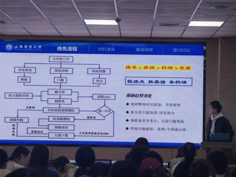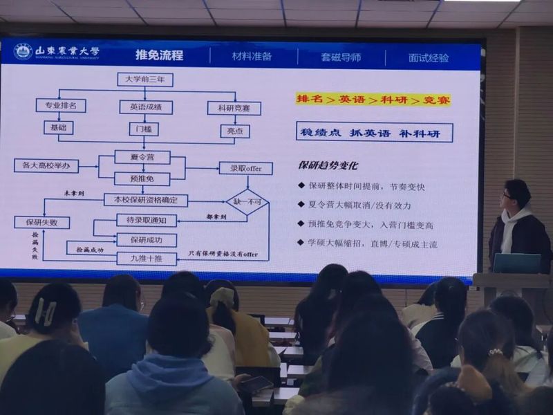 王岩同学从细节把控与心态调整方面带来补充指导。他强调保研是硬实力与细节、心态的综合比拼,材料提交、院校报名等环节需关注截止时间、提交方式等细节,避免疏忽失利。考核前要熟练掌握简历核心内容,准备中英文自我介绍,了解目标院校与导师方向。他建议同学们正视差距、肯定积累,以冷静自信的心态和踏实行动应对保研挑战。