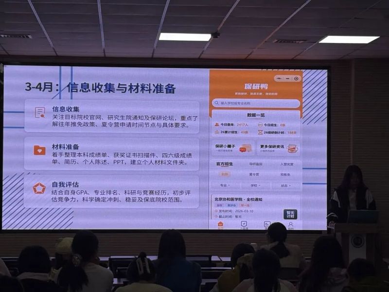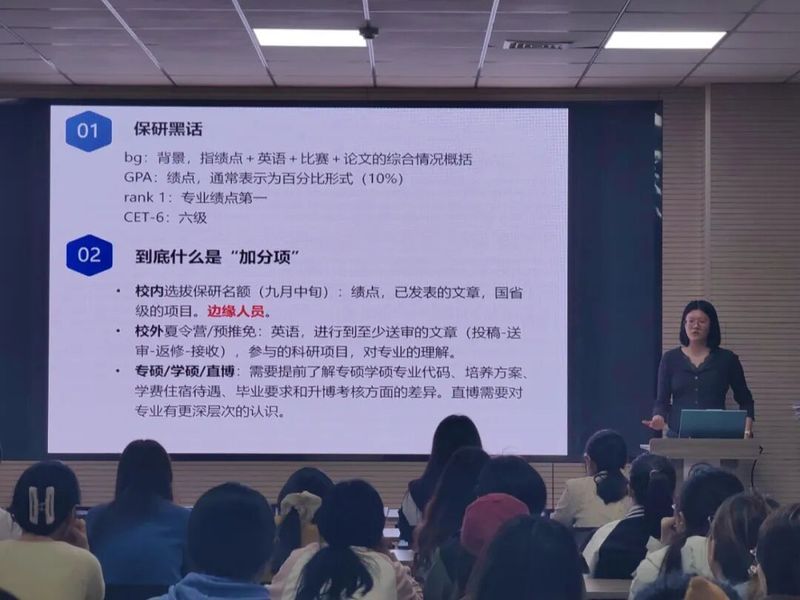 韩洛冰同学以保研至中国科学院大学杭州高等研究院药学系的经历为蓝本,分享背景打造、择校择师等实操方案。她建议择校优先匹配本科专业,择专业以兴趣为核心,择师分阶段精准联系。还讲解了夏令营面试、优营获取的要点,提醒同学们坦诚与导师沟通,杜绝失信行为。