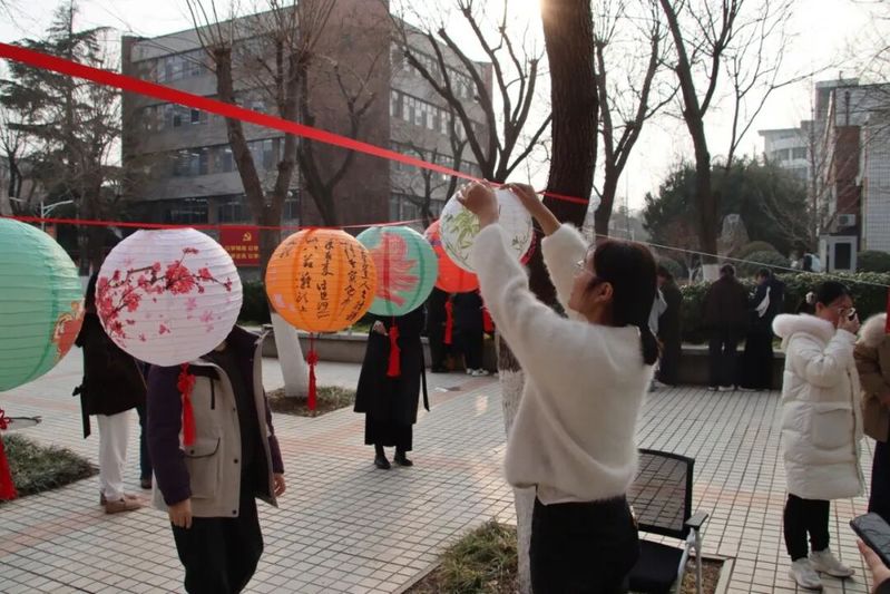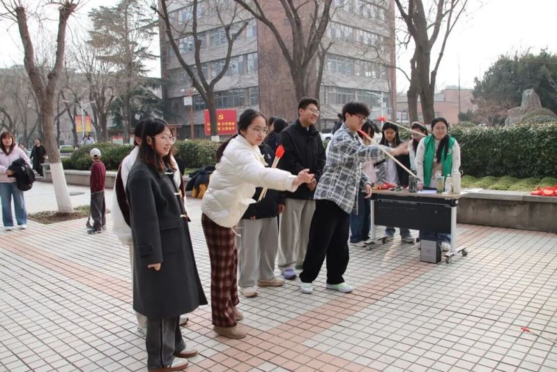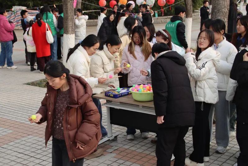 活动现场热闹非凡,处处洋溢着节日的喜悦。灯谜大挑战环节,同学们围在一起共同思索、争相作答,在趣味猜谜中领略传统民俗的魅力;元宵接力赛上,各小组默契配合,用筷子夹起“元宵”接力传递,小心翼翼又快速敏捷,掉落重来也毫不气馁,现场加油声、欢呼声此起彼伏;下元宵投壶环节,大家凝神聚力、依次投掷,箭入壶中的瞬间满是欢呼,在传统游戏中体验别样乐趣;手作灯笼DIY环节,同学们分工协作、巧手创作,将缤纷材料变成一盏盏精致花灯,指尖流转的不仅是创意,更是独属于元宵的浪漫。