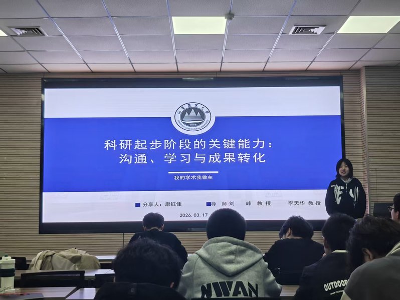康钰佳以“科研起步阶段的关键能力:沟通、学习与成果转化”为主题分享,围绕双导师沟通、高效学习、必备技能、竞赛对接展开:与双导师沟通要注重礼仪、分别交流,实质讨论时聚焦重点并做好记录与后续落实;高效学习核心是以日志记录工作,明确试验目的,及时向师兄师姐请教并同步日志寻求指导;需掌握知网等文献阅读工具,以及Origin、SolidWorks等数据分析和绘图制图软件;竞赛对接要主动向导师争取机会,优先参与师兄师姐有前期基础的课题,多参赛并打磨项目材料。