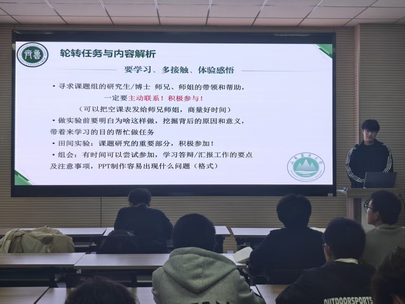 张朝阳核心围绕实验室轮转展开三方面内容介绍:一是明确轮转并非应付任务,核心是学习体验,需主动联系师兄师姐、理解实验意义、参与田间实验和组会;二是讲解轮转需掌握的核心技能,包括文献检索、各类实验操作、生物统计等专业能力,以及英语四六级等基础能力,部分技能依研究方向而定;三是介绍实验室轮转与SRT、竞赛的关联,说明SRT的课题来源、开展价值,还展示了其立项依据和相关小麦基因研究的实验方案,最后为同学提供了线上咨询渠道并送上祝愿。