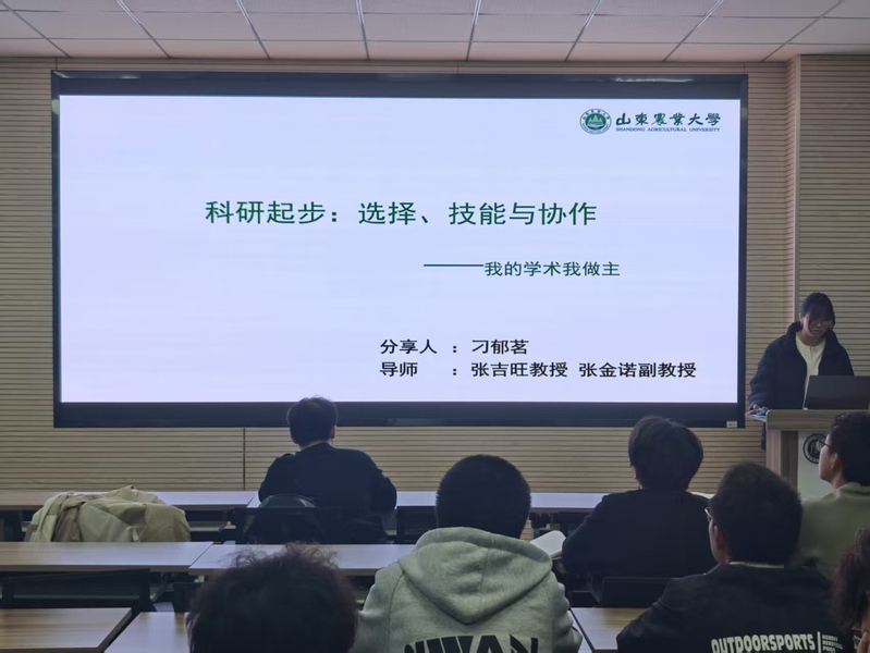刁郁茗以“科研起步:选择、技能与协作”为主题开展分享,围绕选导、实验室技能、双导师制、竞赛对接四方面展开:选导需考量指导风格、课题组氛围等因素,可通过多渠道了解导师研究方向避坑;实验室要掌握知网等文献阅读工具及小绿鲸阅读器,同时重视实验安全;双导师制中农科类导师把控农业问题与资源,信息/机电类导师负责技术实现,意见分歧时需先梳理并拟折中方案,沟通要分问题大小对接、提前准备;竞赛对接需主动和导师沟通获取项目,优先做师兄师姐现有项目,多和师姐师兄打磨项目材料以积累成长。